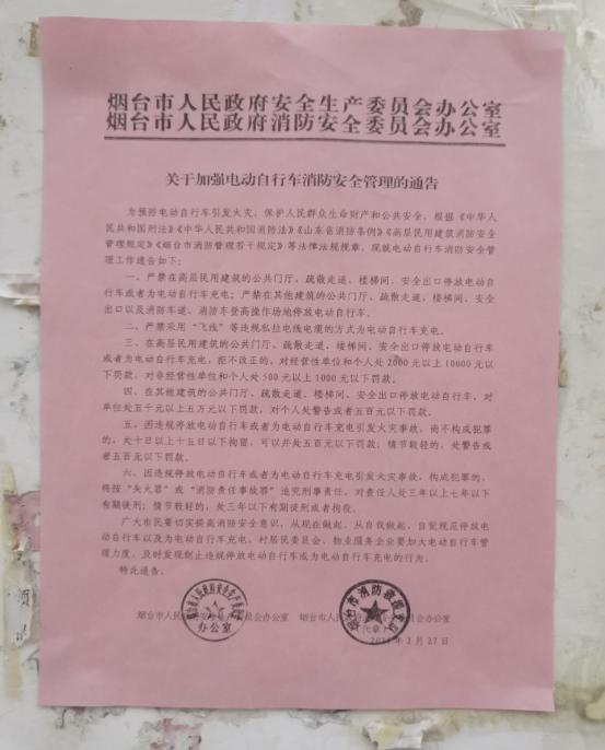 2、打印烟台市人民政府安全生产委员会办公室、烟台市人民政府消防安全委员会办公室《关于加强电动自行车消防安全管理的通告》60余份,分别张贴到学校宣传栏、人员密集场所、各宿舍楼(家属院)的单元门口。